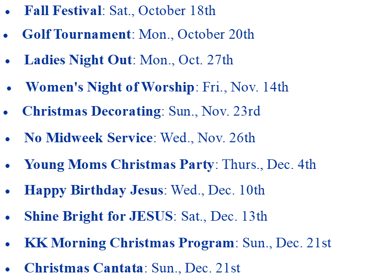 This page is designed to help you plan, prepare and stay up to date with all the upcoming events and activities going on at First Baptist Church of Marshville. The announcements below are the same announcements that are located in our Pre-Service Slides and at our Information Station board in the church foyer. If you have any questions or want any further information you can always contact the church office at 704-624-2710 or email our secretary at secretary@fbcmarshville.org.